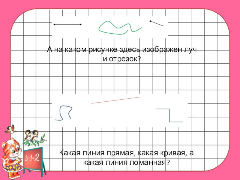 А на каком рисунке здесь изображен луч и отрезок? Какая линия прямая, какая кривая, а какая линия ломанная?