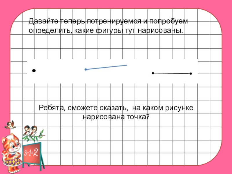 Давайте теперь потренируемся и попробуем определить, какие фигуры тут нарисованы. Ребята, сможете сказать, на каком рисунке нарисована точка?