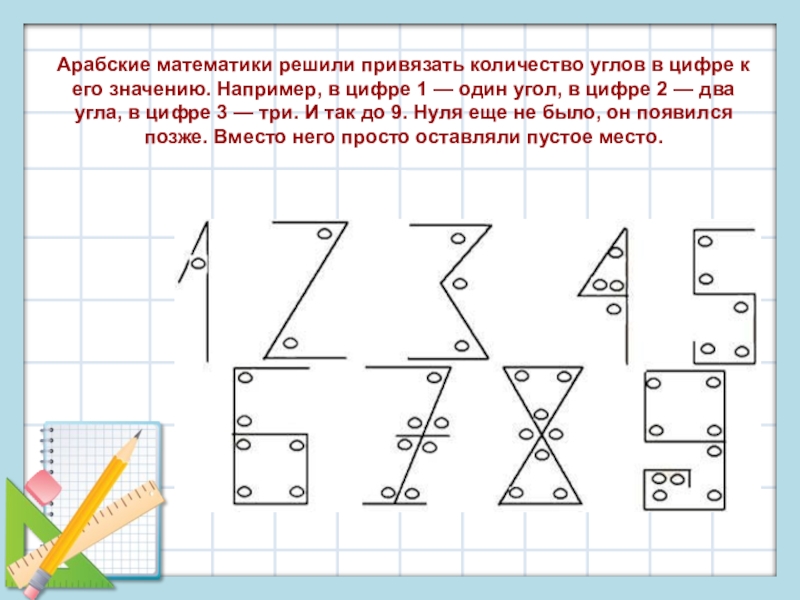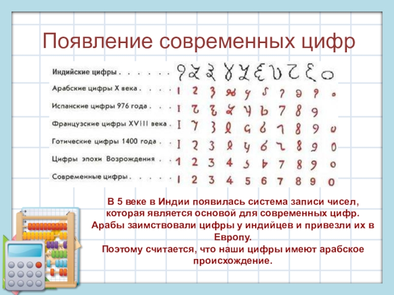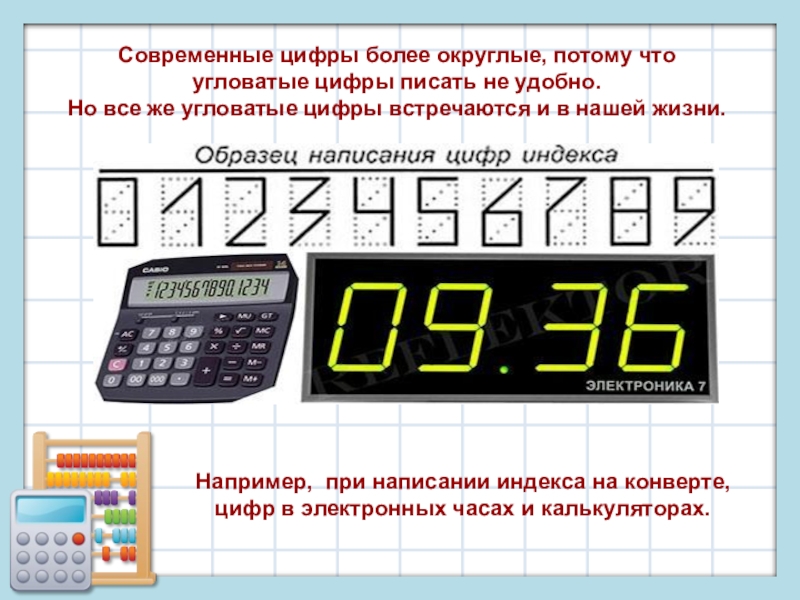 Современные цифры более округлые, потому что угловатые цифры писать не удобно.