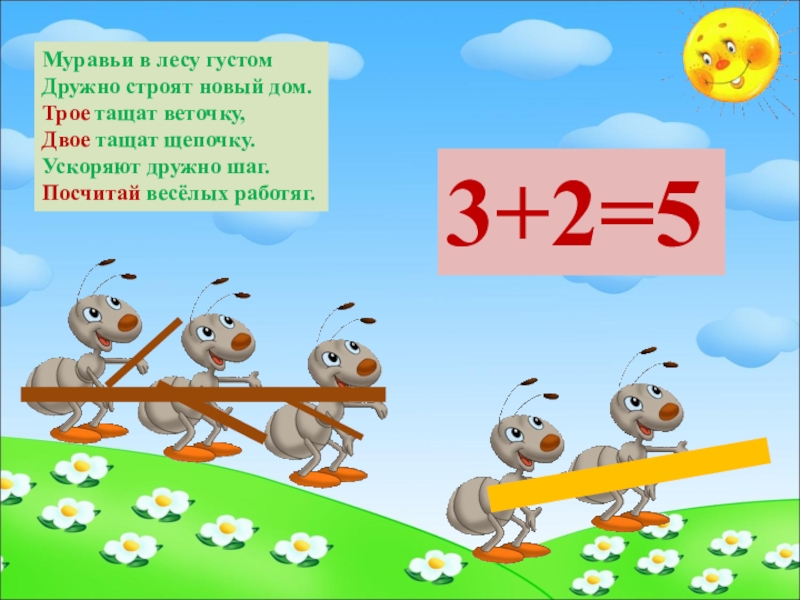 Муравьи в лесу густомДружно строят новый дом.Трое тащат веточку,Двое тащат щепочку.Ускоряют дружно шаг.Посчитай весёлых работяг.3+2=5