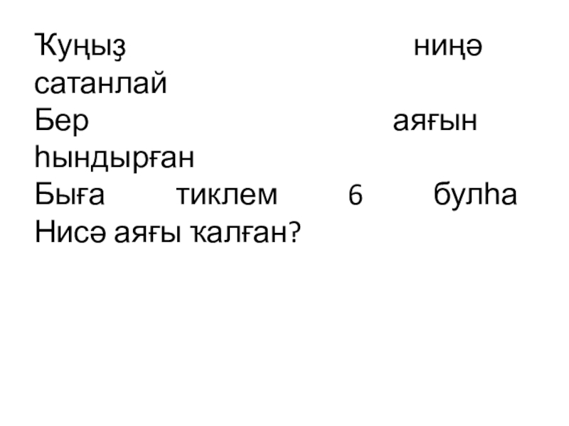Бер аяғын һындырған                           Быға тиклем 6 булһа                               Нисә аяғы ҡалған?