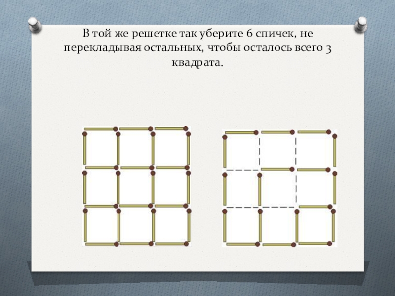 Слайд 12В той же решетке так уберите 6 спичек, не перекладывая остальных,