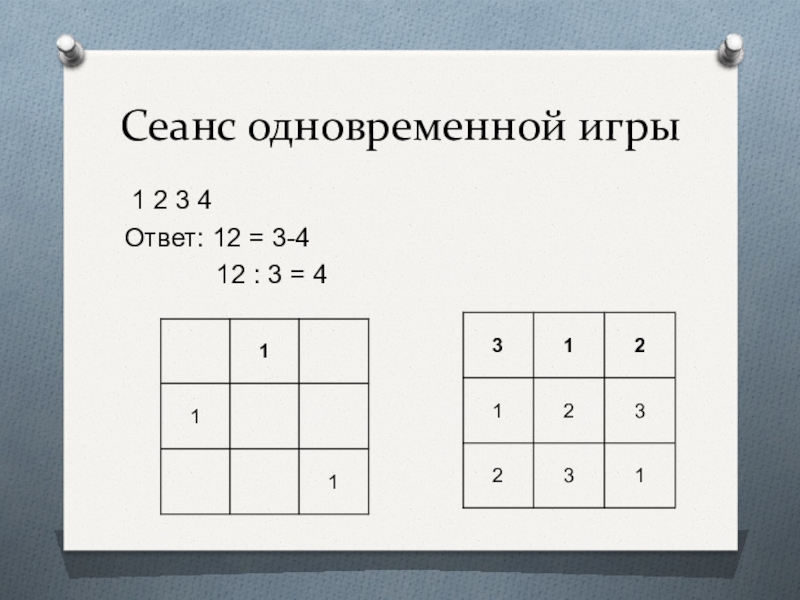 Сеанс одновременной игры 1 2 3 4   Ответ: 12 = 3-412 : 3 = 4