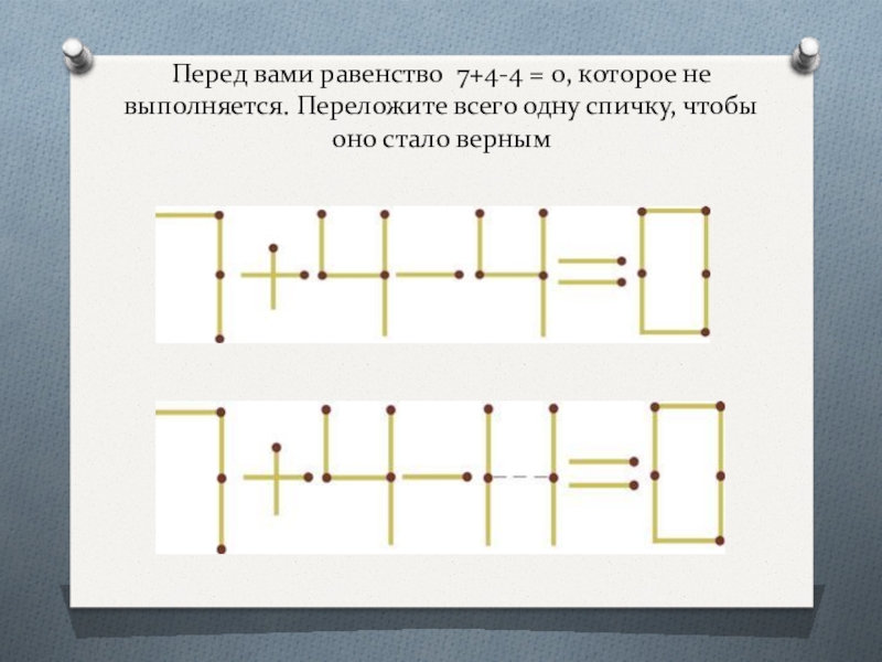 Перед вами равенство 7+4-4 = 0, которое не выполняется. Переложите всего одну спичку, чтобы оно стало верным