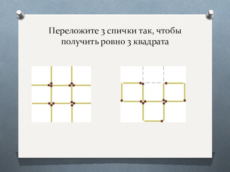 Слайд 10Переложите 3 спички так, чтобы получить ровно 3 квадрата