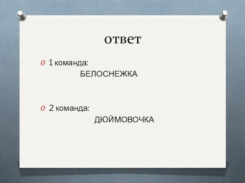 ответ1 команда:            БЕЛОСНЕЖКА2 команда:  ДЮЙМОВОЧКА