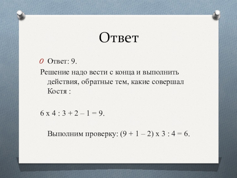 ОтветОтвет: 9.Решение надо вести с конца и выполнить действия, обратные тем, какие совершал Костя :6 х 4