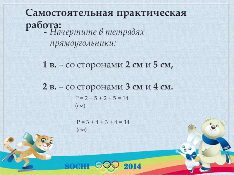 Р = 2 + 5 + 2 + 5 = 14 (см)