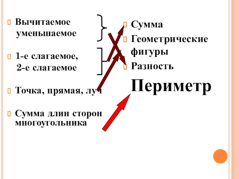 Вычитаемое  уменьшаемое1-е слагаемое,  2-е слагаемоеТочка, прямая, лучСумма длин сторон многоугольникаСуммаГеометрические фигурыРазность  Периметр