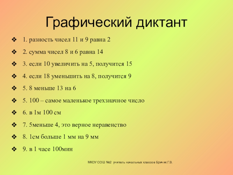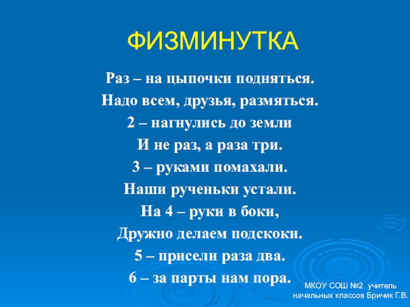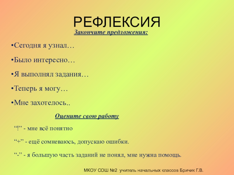 МКОУ СОШ №2 учитель начальных классов Бричик Г.В.