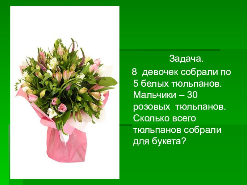8 девочек собрали по 5 белых тюльпанов. Мальчики – 30 розовых тюльпанов. Сколько всего тюльпанов собрали для букета?