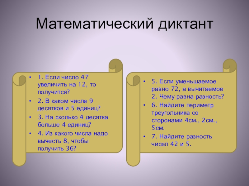 5. Если уменьшаемое равно 72, а вычитаемое 2. Чему равна разность?