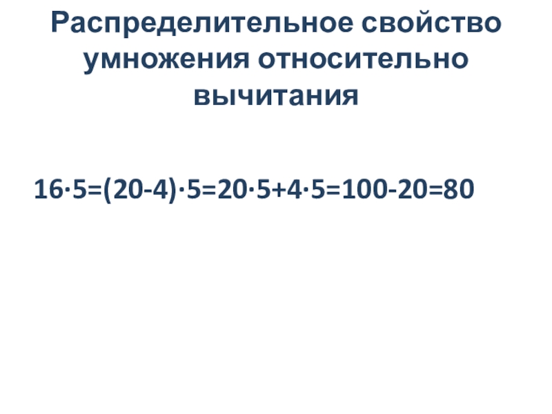 Распределительное свойство умножения относительно вычитания16·5=(20-4)·5=20·5+4·5=100-20=80