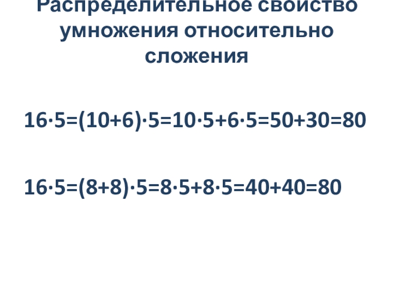Распределительное свойство умножения относительно сложения 16·5=(10+6)·5=10·5+6·5=50+30=8016·5=(8+8)·5=8·5+8·5=40+40=80