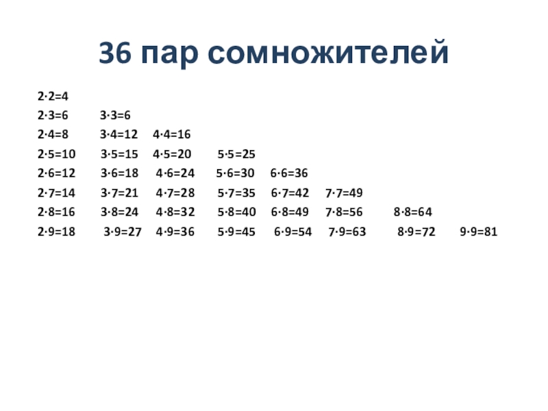 36 пар сомножителей2·2=42·3=6     3·3=62·4=8     3·4=12	 4·4=162·5=10