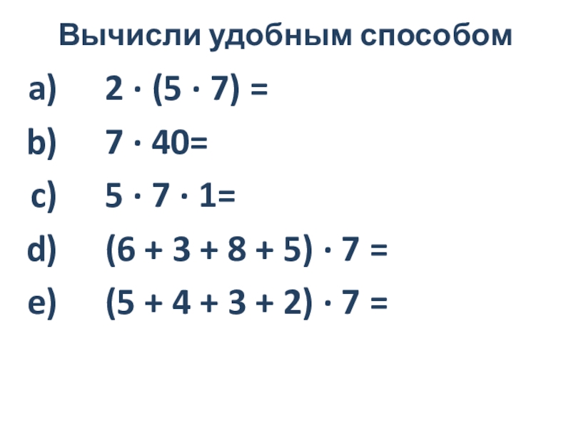 Вычисли удобным способом  2 · (5 · 7) = 7 · 40= 5 · 7 ·
