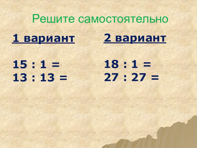 Решите самостоятельно 1 вариант15 : 1 = 13 : 13 =2 вариант18 : 1 = 27 :