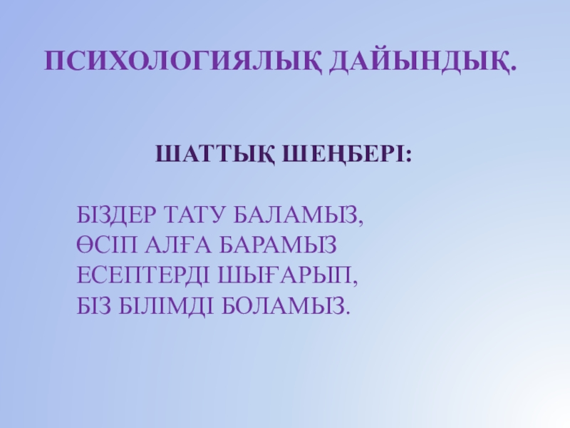 Психологиялық дайындық. Шаттық шеңбері: 		Біздер тату баламыз,		Өсіп алға барамыз		Есептерді шығарып,		Біз білімді боламыз.
