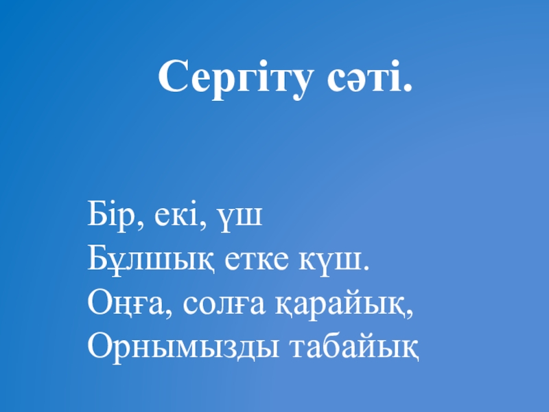 Сергіту сәті.Бір, екі, үшБұлшық етке күш.Оңға, солға қарайық,Орнымызды табайық
