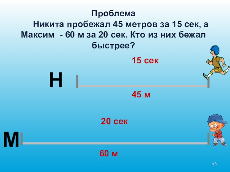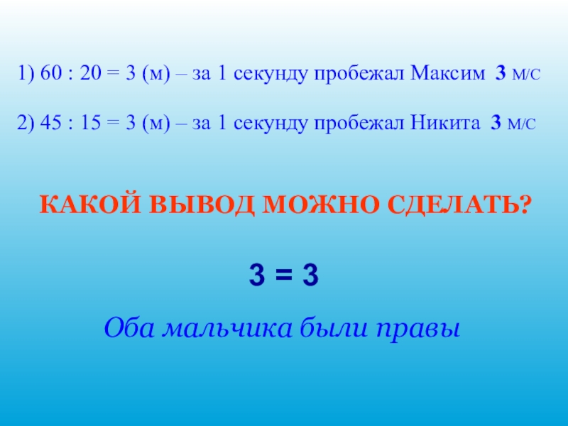 2) 45 : 15 = 3 (м) – за 1 секунду пробежал Никита