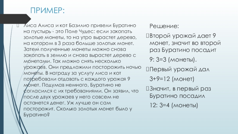Поле Чудес: если закопать золотые монеты, то на утро вырастет дерево, на котором в 3 раза больше золотых монет. Затем полученные монеты можно снова закопать в землю и снова вырастет дерево с монетами. Так можно снять несколько урожаев. Они предложили посторожить ночью монеты. В награду за услугу лиса и кот потребовали отдавать с каждого урожая 9 монет. Подумав немного, Буратино не согласился с их требованиями. Он заявил, что после двух урожаев у него совсем не останется денег. Уж лучше он сам посторожит. Сколько золотых монет было у Буратино?