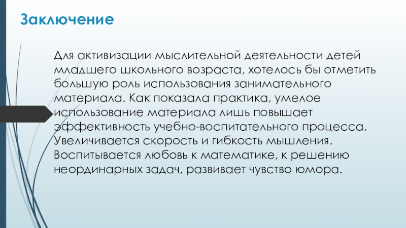 большую роль использования занимательного материала. Как показала практика, умелое использование материала лишь повышает эффективность учебно-воспитательного процесса. Увеличивается скорость и гибкость мышления. Воспитывается любовь к математике, к решению неординарных задач, развивает чувство юмора.