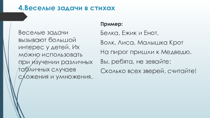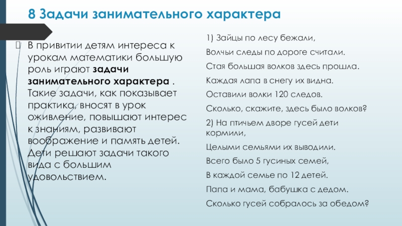 роль играют задачи занимательного характера . Такие задачи, как показывает практика, вносят в урок оживление, повышают интерес к знаниям, развивают воображение и память детей. Дети решают задачи такого вида с большим удовольствием.