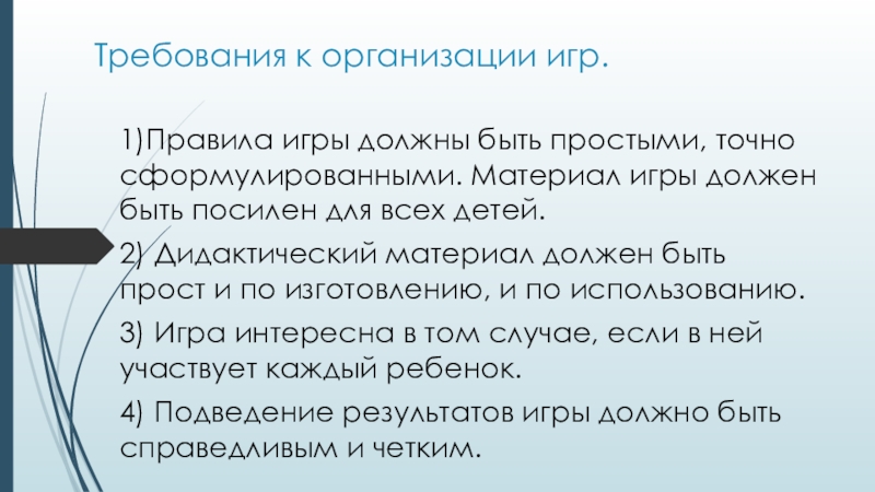 1)Правила игры должны быть простыми, точно сформулированными. Материал