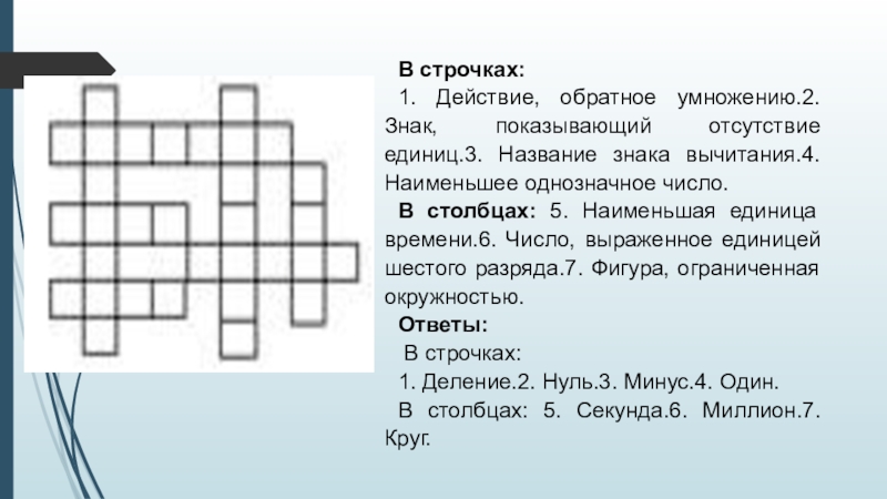 В столбцах: 5. Наименьшая единица времени.6. Число, выраженное единицей шестого разряда.7. Фигура, ограниченная окружностью.
