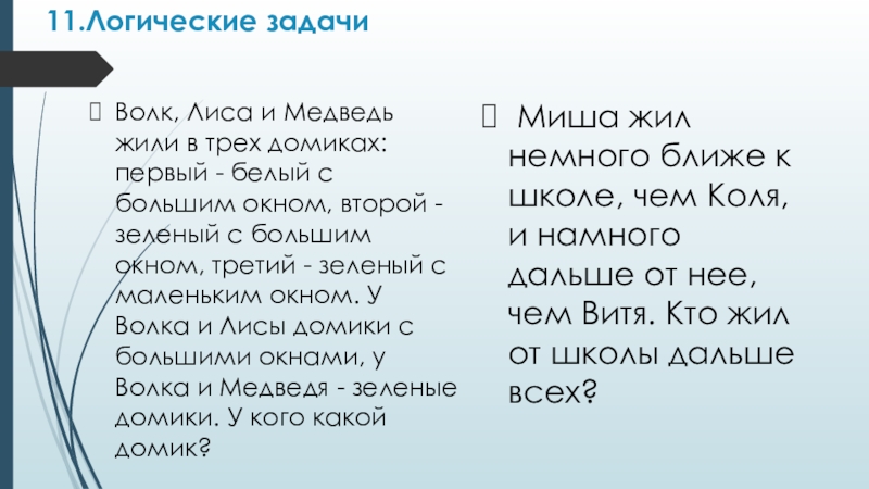 белый с большим окном, второй - зеленый с большим окном, третий - зеленый с маленьким окном. У Волка и Лисы домики с большими окнами, у Волка и Медведя - зеленые домики. У кого какой домик?