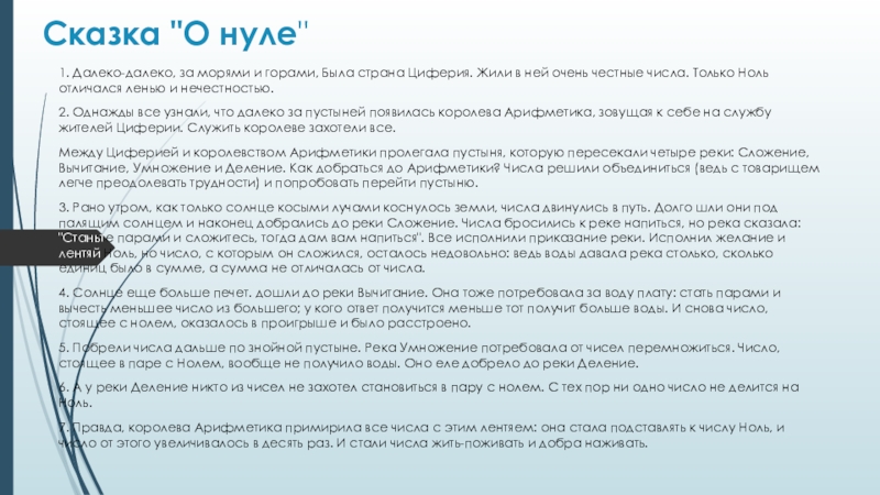 7. Правда, королева Арифметика примирила все числа с этим лентяем: она стала подставлять к числу Ноль, и число от этого увеличивалось в десять раз. И стали числа жить-поживать и добра наживать.