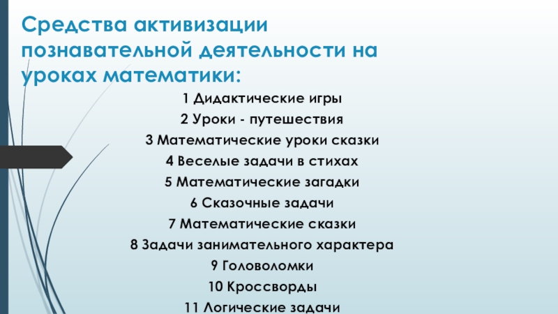 Слайд 3Средства активизации познавательной деятельности на уроках математики: