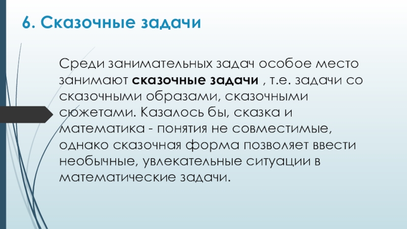 Среди занимательных задач особое место занимают сказочные задачи , т.е. задачи