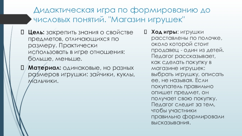 Слайд 7Дидактическая игра по формированию до числовых понятий. "Магазин игрушек"