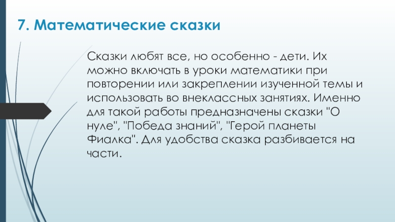 включать в уроки математики при повторении или закреплении изученной темы и использовать во внеклассных занятиях. Именно для такой работы предназначены сказки "О нуле", "Победа знаний", "Герой планеты Фиалка". Для удобства сказка разбивается на части.