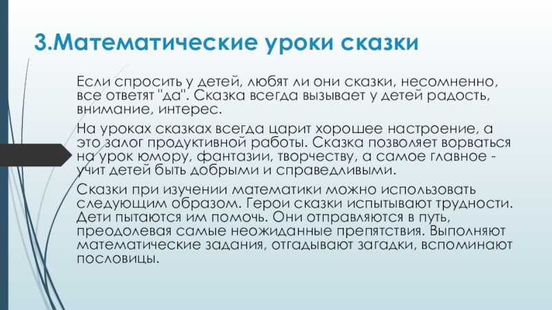 Сказки при изучении математики можно использовать следующим образом. Герои сказки испытывают трудности. Дети пытаются им помочь. Они отправляются в путь, преодолевая самые неожиданные препятствия. Выполняют математические задания, отгадывают загадки, вспоминают пословицы.