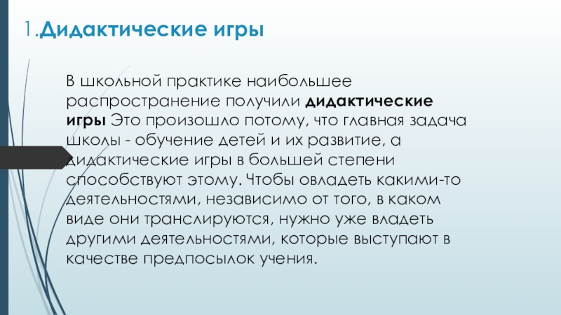 В школьной практике наибольшее распространение получили дидактические игры Это произошло потому,