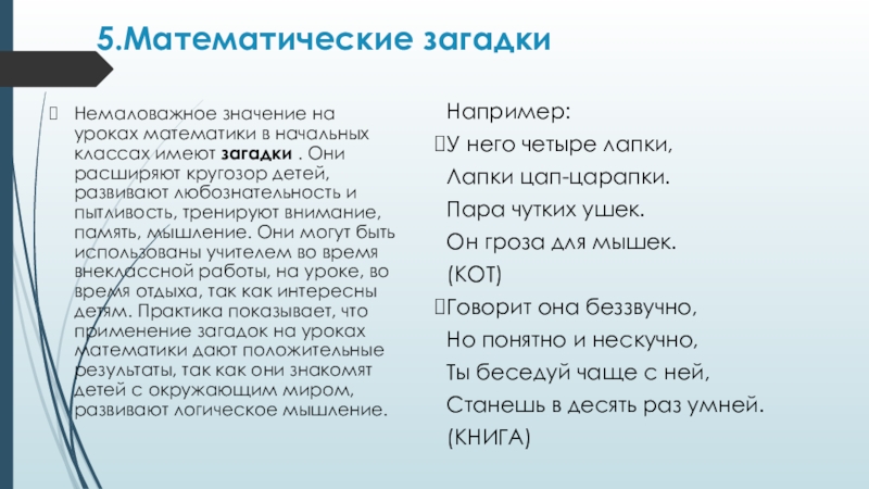 расширяют кругозор детей, развивают любознательность и пытливость, тренируют внимание, память, мышление. Они могут быть использованы учителем во время внеклассной работы, на уроке, во время отдыха, так как интересны детям. Практика показывает, что применение загадок на уроках математики дают положительные результаты, так как они знакомят детей с окружающим миром, развивают логическое мышление.