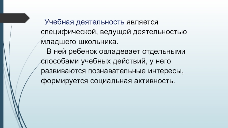 Слайд 2Учебная деятельность является специфической, ведущей деятельностью младшего школьника.