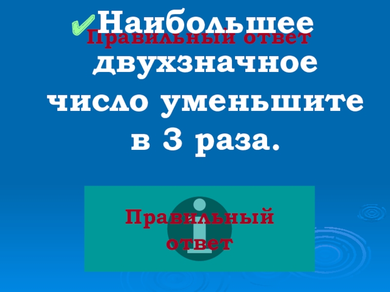 Правильный ответНаибольшее двухзначное число уменьшите в 3 раза.Правильный ответ