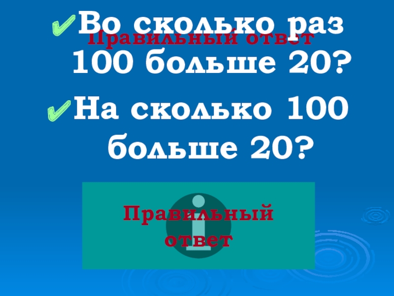 Правильный ответВо сколько раз 100 больше 20?На сколько 100 больше 20?Правильный ответ