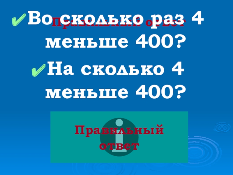 Правильный ответВо сколько раз 4 меньше 400?На сколько 4 меньше 400?Правильный ответ