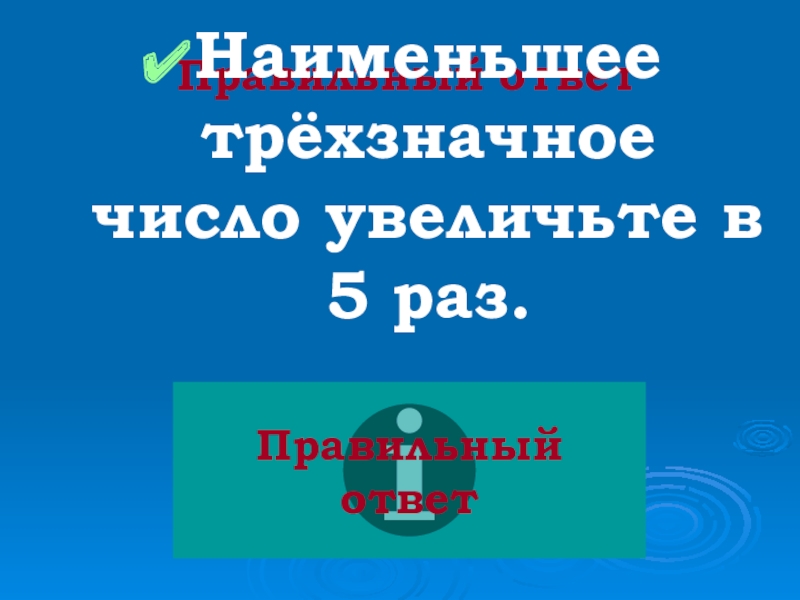 Правильный ответНаименьшее трёхзначное число увеличьте в 5 раз.Правильный ответ