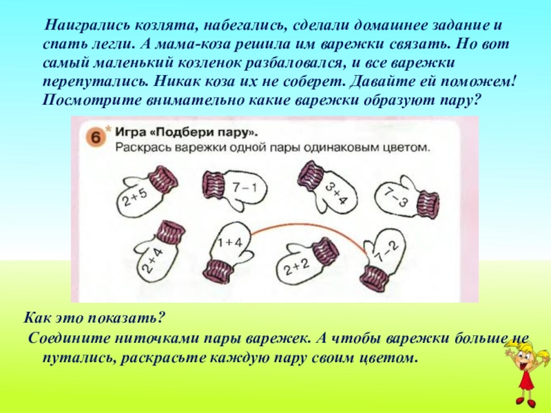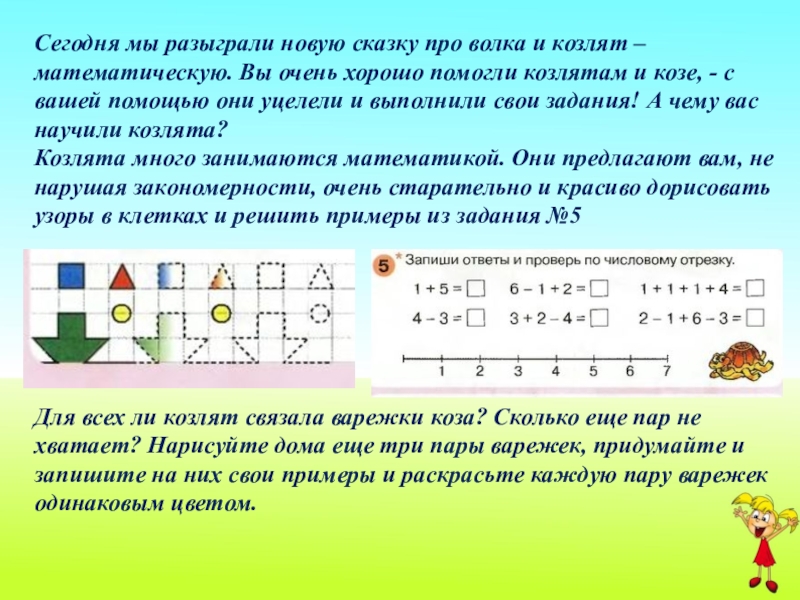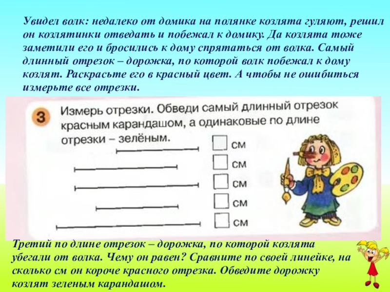 Третий по длине отрезок – дорожка, по которой козлята убегали от волка. Чему он равен? Сравните по своей линейке, на сколько см он короче красного отрезка. Обведите дорожку козлят зеленым карандашом.