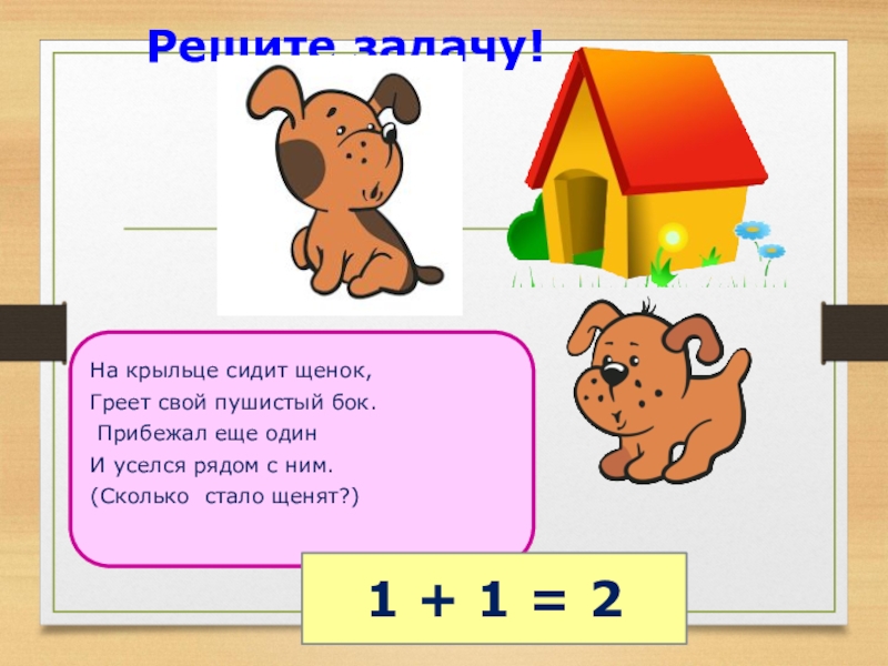 Решите задачу!На крыльце сидит щенок,Греет свой пушистый бок. Прибежал еще одинИ уселся рядом с ним.(Сколько  стало щенят?)1