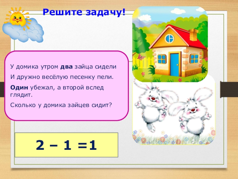 У домика утром два зайца сиделиИ дружно весёлую песенку пели.Один убежал, а второй вслед глядит.Сколько у домика