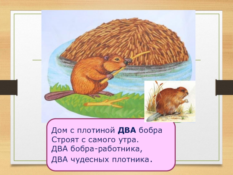 Слайд 2Дом с плотиной ДВА бобра Строят с самого утра. ДВА бобра-работника, ДВА чудесных плотника.