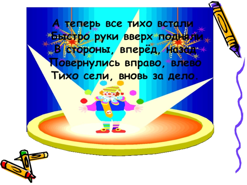 А теперь все тихо встали Быстро руки вверх подняли В стороны, вперёд, назад Повернулись вправо, влево Тихо