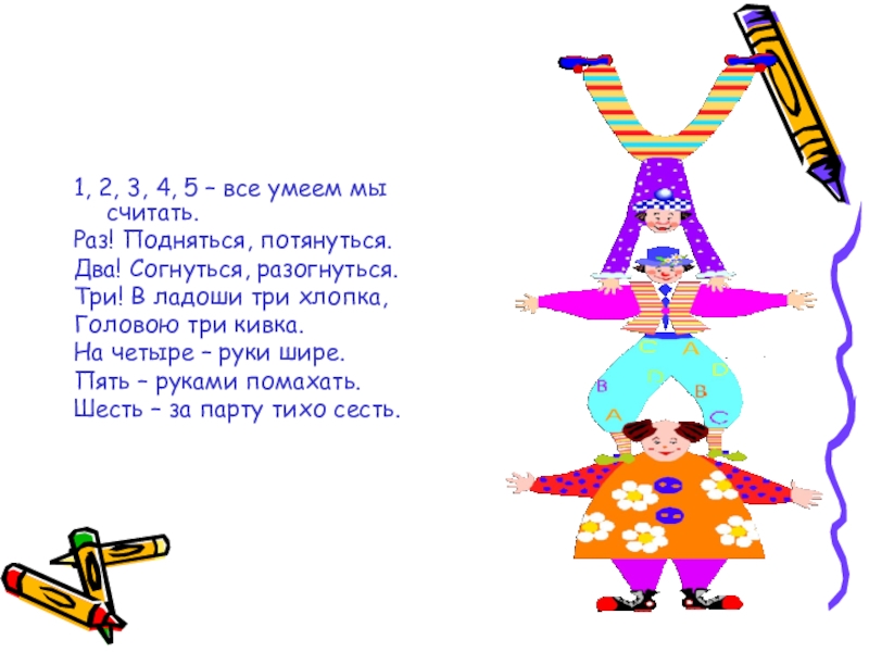 1, 2, 3, 4, 5 – все умеем мы считать.Раз! Подняться, потянуться.Два! Согнуться, разогнуться.Три! В ладоши три