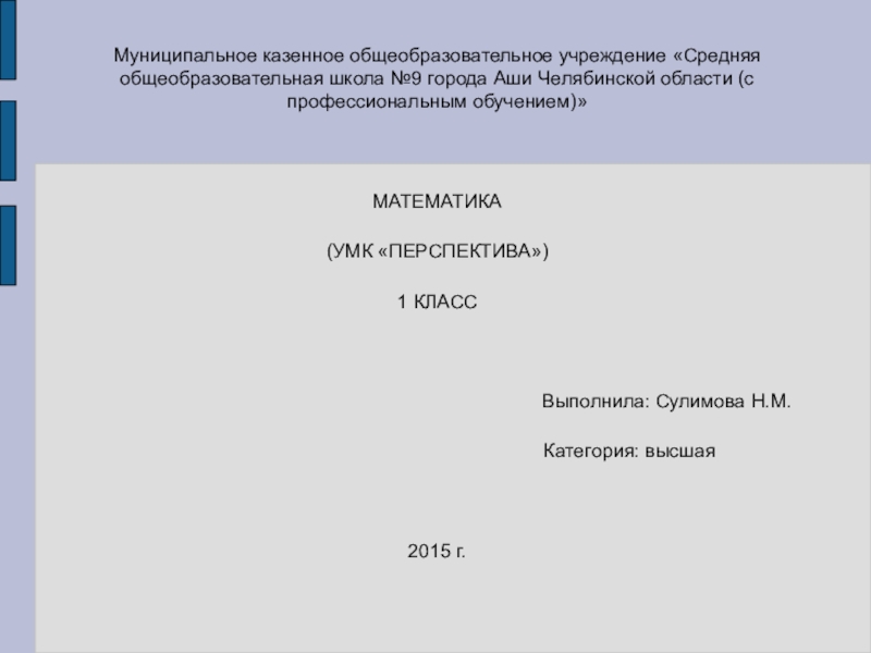Муниципальное казенное общеобразовательное учреждение «Средняя общеобразовательная школа №9 города Аши Челябинской области (с профессиональным обучением)»МАТЕМАТИКА (УМК «ПЕРСПЕКТИВА»)1 КЛАСС